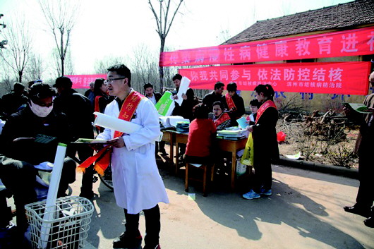 24日,滨州市中心医院派出医疗专家组联合惠民县疾控中心、皂户李卫生院到皂户李镇苗木大市场开展“世界防治结核病日”宣传活动。