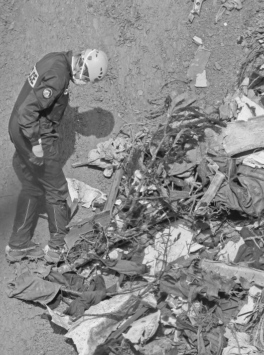 29日,在法国南部上普罗旺斯阿尔卑斯省山区,一名法国调查员检查飞机残骸。 新华/路透