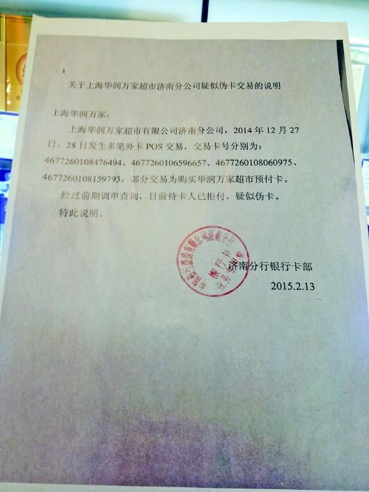中国银行工作人员介绍,去年12月27日在华润万家发生多次单人持多张外卡交易的情况。大约在今年2月初,济南分行接到总行的风险提示,济南分行到华润万家调单查询后,发现为疑似伪卡交易。