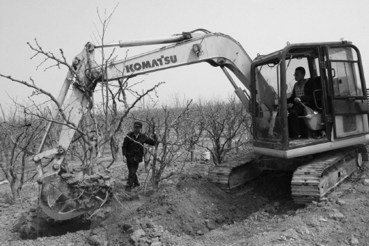 30日,在沾化区黄升镇7000亩农业综合开发高标准农田建设项目现场,蔺皮村村民皮文田指挥挖掘机移种冬枣树。据了解,黄升镇的7000亩农业综合开发高标准农田建设项目将于5月份全面完成。