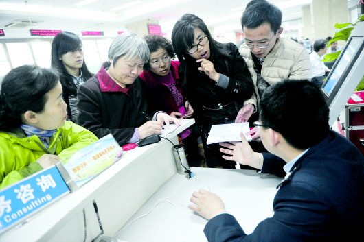 3月31日,在济南房产大厦二楼的税务咨询台前,大批市民咨询营业税“5改2”事宜。 本报记者 王媛 摄