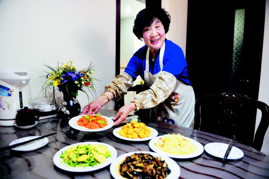 在冯广英阿姨的家里,有两大柜子的各式调料,这只是她做出好菜的秘密武器之一。冯阿姨说,日积月累,自己也把做菜当成了一项爱好,常常会研究一些新菜式,同时也让家人之间更加紧密。“儿子最爱软炸虾仁,孙女喜欢吃香菇炒肉,媳妇喜欢吃酸的,醋溜土豆丝几乎每天都上我们家的餐桌,胡萝卜炒青椒大伙喝酒的时候我要炒好几回。我喜欢吃素,也变着花样做素菜给他们解解油腻刮刮油。”说到这些,冯阿姨一脸幸福。