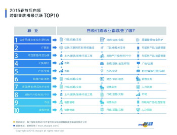 近年来,在人才跨界的大趋势下,白领们跨行业流动成为一种现象。《智联招聘2015春季人才流动分析报告》显示,政府/公共事业/非盈利机构、零售/批发、通信/电信运营、增值服务等行业白领跨界跳槽最活跃。多数白领跨界跳槽选择了房地产、互联网/电子商务等行业。