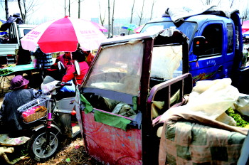 李金锋躲在一辆三轮车里,寻找可疑目标。