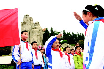 3月31日,青岛上海支路小学一年级学生在青岛革命烈士纪念馆缅怀先烈后,参加了新队员入队活动。高年级的学生为一年级学生系上鲜红的红领巾。该校校长李朝阳说,在革命烈士墓前庄严宣誓入队,让少先队员受到了深刻的爱国主义、集体主义、责任感教育。