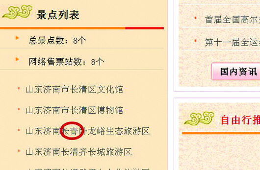 在记者浏览的网站中,长清区旅游局官方网站出现的问题较多。在该局的网站首页,“景点列表”下方列出了若干个文化馆、博物馆及长清景点的名称。记者发现,“长清卧龙峪生态旅游区”竟然被写成了“长青卧龙峪生态旅游区”。记者随机点击了“景点列表”下的一处链接,打开了一个新网页,但令人出乎意料的是,显示内容均为错误提示和代码。记者又点击了其他景点链接,情况同样如此,景点的介绍完全看不到,网站成了空架子。