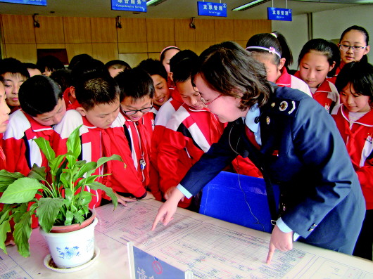 近日,济北小学六年级5班45名学生排着整齐的队伍来到了济阳县地税局服务大厅,工作人员非常耐心地为大家讲解了大厅内导税台、办税服务区、填单服务区等不同区域的作用。