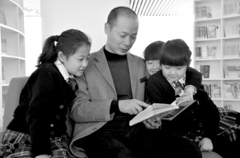 ◥沈建华和学生们在一起看书。