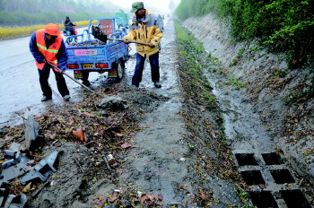 上午10点,当记者赶到潍县中路铁路桥时,这里的积水已排完,路上还有淤泥,三位环卫工人正在忙着清理垃圾。“这些全是随着雨水冲过来的垃圾,我们在这里等了四个小时,雨才下去。”环卫工人告诉记者,他们六点来上班的时候,桥下积水达到了90厘米,根本无法进去。