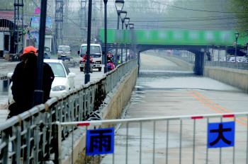 2日,牡丹南路涵洞被淹,车辆只能从两侧通行。本报记者 邓兴宇 摄