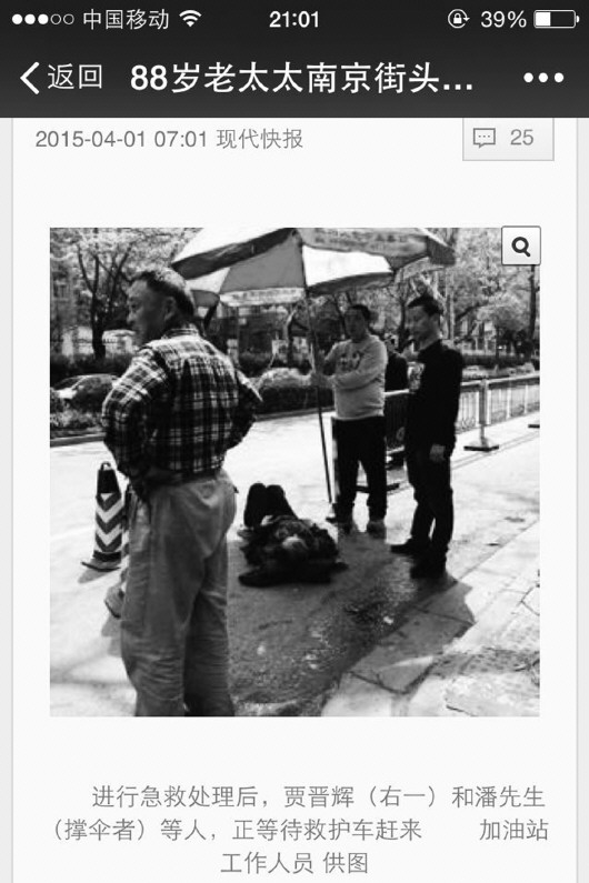 据他讲述,当天下夜班回家,在南京市宁海路南京师范大学附近加油站加完油后正准备上车,就看到不远处有一个老人昏倒在地。“离加油站很近,也就七八米远,我连车门都没有来得及锁,就跑了过去。”贾晋辉回忆说,“当时我跑过去以后那个花店老板跟我说‘不要碰她’,我就说‘没事,我是医生。’”,于是,贾晋辉立马查看老人情况。
