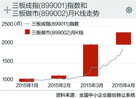 虽然沪指一路站上3800点,但相比新三板,A股的涨幅就显得有些“微不足道”了。一位券商负责人说,截至3月底,2015年三板成指和三板做市指数累计上涨达62.9%和89.5%,涨幅远远高于上证综指及深证成指,“如果从整个市场风口来说,最大泡沫的地方不是创业板,也不是‘互联网+’等成长股,现在最热门的是新三板。”