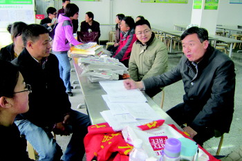 6日下午3点多,39中的招生咨询会上,校长白刚勋(右一)耐心为最后几名家长答疑解惑。
