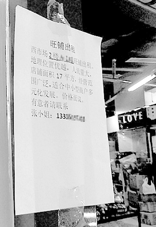 西市场一家商铺贴出了招租的启事。 本报记者 任磊磊 摄