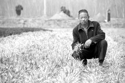▲吕志强家的麦田浇过受污染的水后,麦苗变黄枯萎。