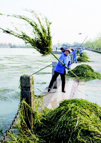 随着天气转暖,东昌湖中的水草开始疯长。4月7日,东昌湖管理部门组织的四十多人打捞队,在湖上大“战”水草,这样的工作将持续至五一前后。
