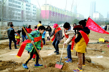 在城区一块裸露土地上,几名小朋友积极参与绿化。