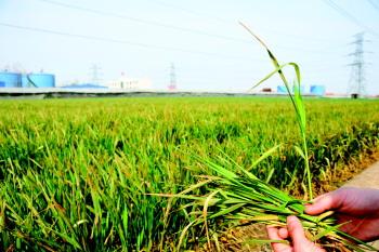 麦苗从上往下变得枯黄,村民怀疑和附近的企业有关。 本报记者 王鸿哲 摄