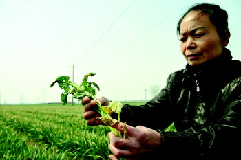 本来正处于拔节期的小麦应该是郁郁葱葱,生长正旺盛的时候,然而在临淄区敬仲镇蔡店村的300多亩小麦却出现了不同程度的枯黄。“本来我们这儿地就少,这下可能要绝产了。”两亩小麦几乎全部枯黄的蔡店村村民王金友说。