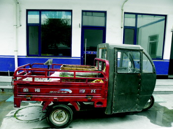 嫌疑人作案用的三轮车(大图)及三轮车上盗取的三块电瓶(小图)。 警方供图