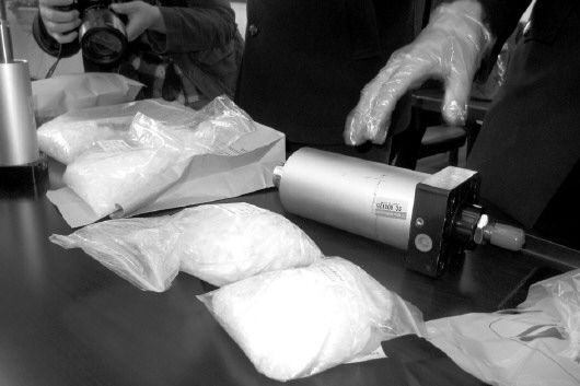 民警检查包裹,包裹里是两个一大一小的气缸。在用特殊工具打开后,气缸里是两包共重500克的冰毒。头目被抓,集中收网的时机已经成熟。临淄公安机关当即组织40名民警,分成8个小组,23日当晚便将老董、老唐、田哥、小于等12个涉案人员全部抓获归案。