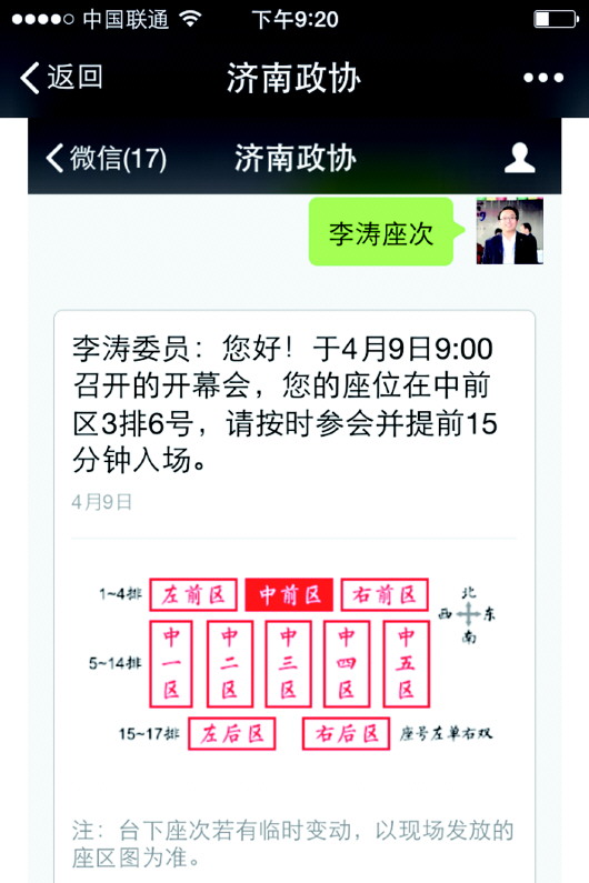▲委员在济南政协的微信上输入名字后,会收到座次消息和找座指南。