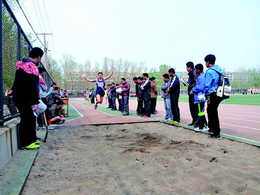 9日上午,济阳县2015年中小学生田径运动会在山东省济北中学召开。本次运动会倡导节俭,开幕式取消鼓号队等节目,仅由运动员列队展示风采。本次运动会比赛为期两天,包括田径、拔河、羽毛球等项目,25个代表队参赛。图为运动员在跳远比赛中。