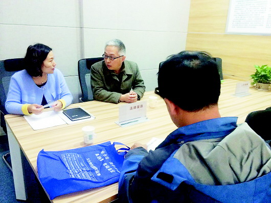 ◥工作人员与法律顾问一起接待来访居民。