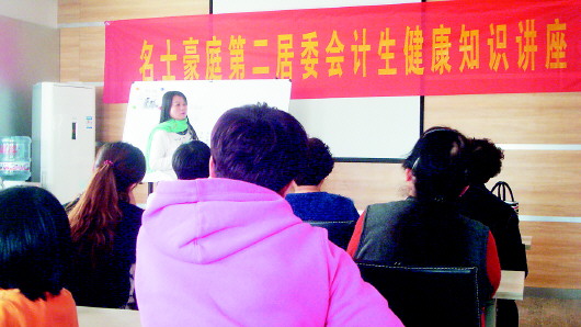 3月29日,名士豪庭第二社区举办了计生知识讲座。居委会主任杨奎香讲解了计划生育相关法律法规及有关最新政策、生殖健康、优生优育等常用知识。 通讯员 高燕 摄