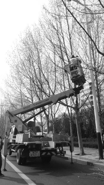 春季行道树长出新枝,9日下午,市政设施管理人员在东方红路上剪下靠近路灯的树枝,保障路灯照明。 本报记者 徐良 摄