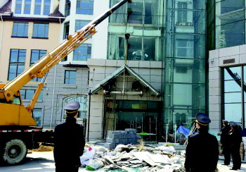 9日,在极地金岸二期,崂山城管强制拆除了一家商铺入口处的违建门厅。当日上午,执法人员巡查发现该商铺正在违法搭建一处门厅,违建当事人不听劝阻,在现场阻挠5个多小时。执法人员调来吊车等机械,将该处违建强制拆除。
