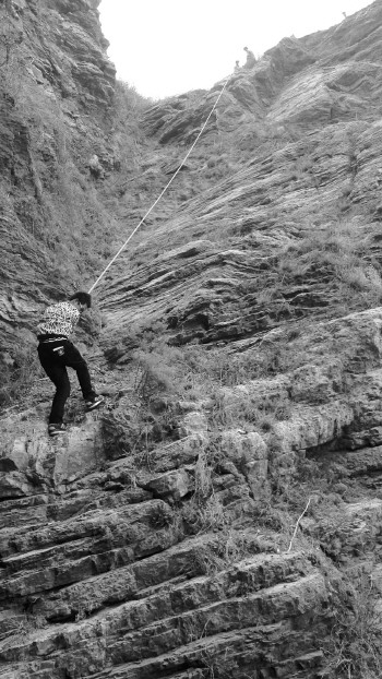 掌握情况后,消防官兵携带一条较粗的绳索,绳索的一头系在山顶城墙上,另一头绑上安全带,从悬崖顶部将救生绳索放下去,然后通过喊话的方式让两名学生将安全带绑在自己身上。