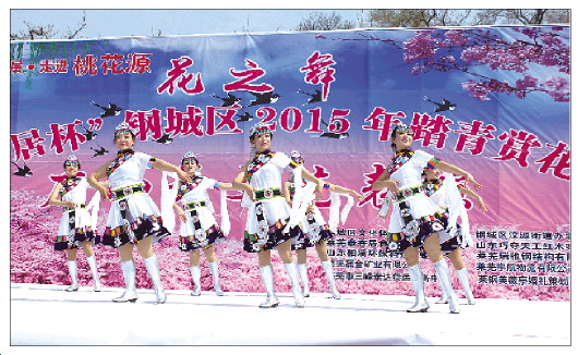 4月11日,汶源街道“花之舞”广场舞文艺表演在霞峰村举行,冠世桃源十万亩桃花开放,引得数千名游客前来观赏。