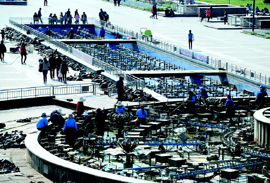 14日,泉城广场,大批工人为荷花喷泉清理垃圾和污物,清理出的垃圾装了上百袋子。为了迎接五一和春季旅游旺季,广场为喷泉洗澡,并进行设备检修。 本报记者 周青先 摄