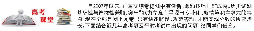 自2007年以来,山东文综卷稳健中有创新,命题技巧日渐成熟。历史试题基础性与选拔性兼顾,突出“能力立意”,呈现出专业化、新情境和主题式的特点。现在全部是网上阅卷。只有快速解题、规范答题,才能实现分数的快速增长。下面结合近几年高考题及平时考试中出现的问题,给同学们借鉴。