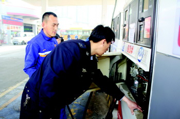 执法人员检查加油箱的油气污染防治设施运行情况。 吕璐 摄