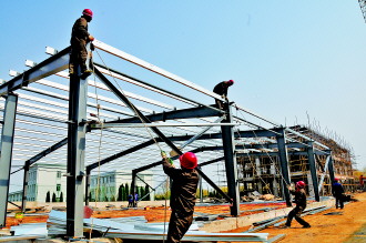 ◤康辉生物科技公司施工现场,工人们正在4号车间上梁。 张蓓蓓 摄