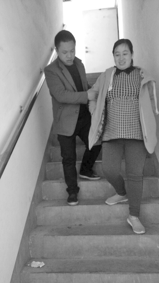 张先生扶着怀孕七个半月的妻子下楼。本报记者 郭庆文 摄