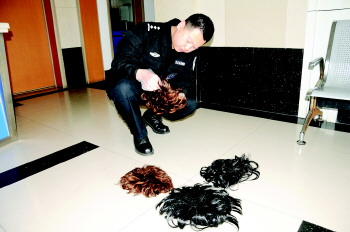 办案民警正在对嫌疑人作案使用的假发套进行检查。