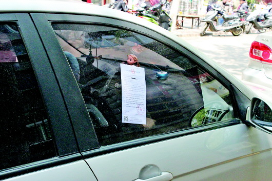 在棋盘小区,不少车辆被贴上“罚单式广告”。 本报记者 孟燕 摄