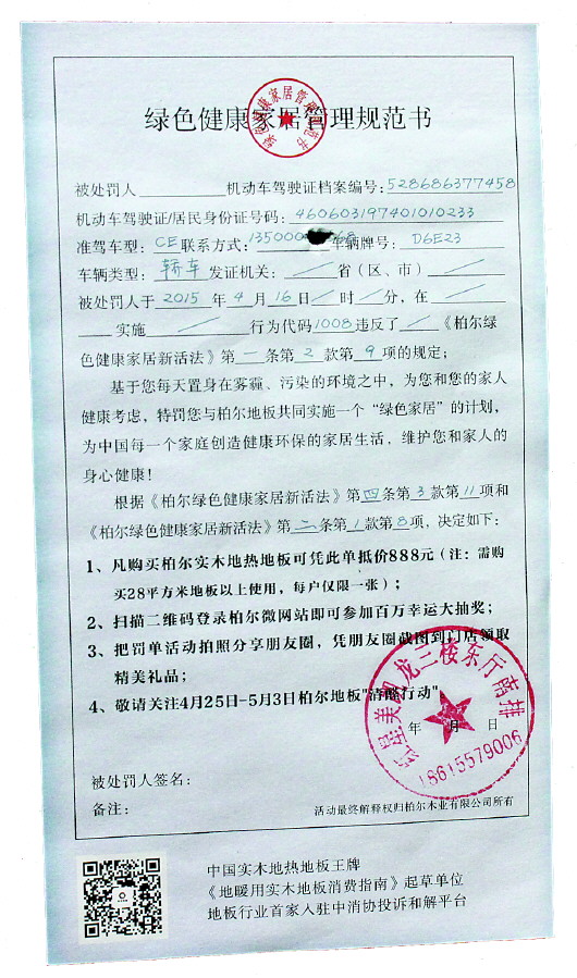 记者注意到,这些“罚单”大多贴在车窗玻璃上。抬头写着《绿色健康家居管理规范书》,“罚单”上印有被处罚人、机动车驾驶证档案编号、车辆类型等,具体数据用蓝色手写体印刷,看上去和真的罚单几乎一样。
