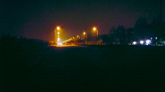 晚上8点左右工业二路上有无路灯的对比。 本报记者 石剑芳 摄