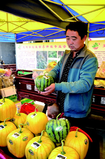 ▲种植户展示方形、心形的特色西瓜,每个西瓜上面都有二维码防伪标识。