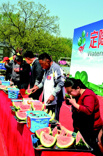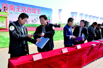据了解,从本周开始,定陶县南王店镇1.2万亩大棚西瓜将逐渐进入盛果期。本届西瓜节上,许多客商专程赶来,现场共签订2200万斤西瓜订单。定陶县委书记张红旗介绍,南王店西瓜因上市早、口感好、品质优远销全国各地,今年南王店早春西瓜刚上市就成了北京、上海等大中城市和大型超市的抢手货。