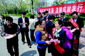 农行淄博开发区支行长期注重法制建设,以“重实效、出效果、保权益、促发展”为宗旨,定期开展宣传活动,积极维护金融消费者合法权益,提供优质金融服务,全力构建和谐金融生态环境。图为该行法制宣传队伍走向街头、深入群众、与客户面对面开展主题宣教活动。