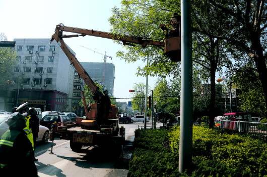 21日上午,槐荫交警在对全区道路巡查的基础上,联合区园林局对全区所有遮挡信号灯,影响安全驾驶的行道树枝杈进行修剪,确保驾驶员对交通信号的准确观察。此外,对于辖区内遮挡视线的广告牌,槐荫交警也向产权单位下发了整改通知,限期不整改者,也予以强制拆除。