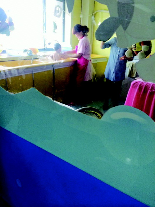 在工作人员的带领下,记者走进浴室,浴室的面积约有50平米,中间摆放了一个盛满水的大水池,水面上漂着一些儿童玩具,工作人员介绍,这个水池是宝宝的游泳池,可以同时容纳五个孩子游泳,周围靠墙的位置摆放着十几个长宽均在1米左右的箱形浴缸,是宝宝洗澡的地方。“我们店里孩子洗澡加游泳是58块钱,单独洗澡的话有也就20多块钱。办会员卡的话就可以享受充500送200,充700送300的优惠。”