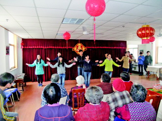 4月20日上午,环翠区民政局组织哈工大(威海)60余位大学生到老年公寓,看望慰问老人,图为学生表演手语舞《大海》。