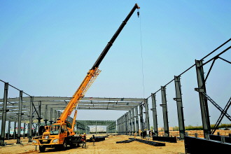 乳山滨海新区骏翔新材料项目现场,工人正在进行施工。 杨大杰 摄