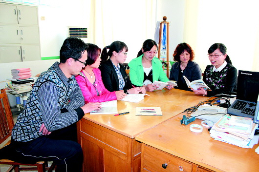 六位老师在一起交流教学心得。